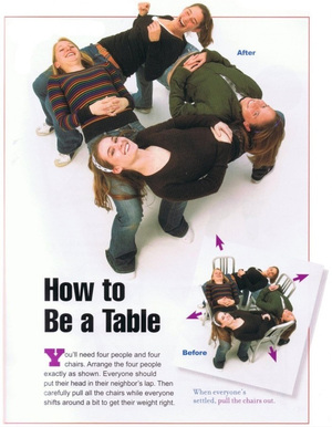 Go On Then. Be A Table Niall Murphy at 8:53 am August 2, 2011 You know you want to do this. All you need is three giddy friends. via FacebookTwitterPinterestSponsored Link Related posts: The Three-Ass Chair A Leg To Stand On Hey. It’s Friday. Let’s All Watch Bill Gates Leap Over A Chair Sit Your Ass Down