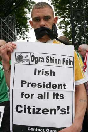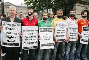 Calling for presidential voting rights to be extended to Northen Ireland citizens this afternoon on Kildare Street were from left Sinn Fein’s Sean Crowe, Jonathan Graham, Donnchadh O’Laoghaire, John Flynn (also pic above), Oisin O Dubhlain and Fionntai Butler.