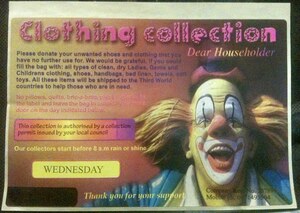 Even If You Liked Clowns Admin at 11:47 am August 31, 2011 This would still be very creepy. Red Mum writes: I got this bogus charity sticker through the door yesterday morning. Obviously I made sure to have a bag of clothes out this morning before they unleashed the clown on me. FacebookTwitterPinterestSponsored Link