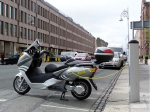 A Vectrix electric motorbike supplied by MCC Controls (21 kilowatt engine, roughly equivalent to a 400cc motorbike) on charge opposite ESB headquarters on Fitzwilliam Street Lower this morning.