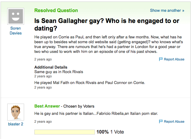 Is Sean Gallagher Gay? Admin at 3:25 pm September 6, 2011 Yahoo Thanks Barry H FacebookTwitterPinterestSponsored Link