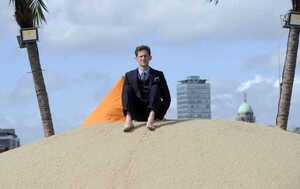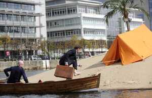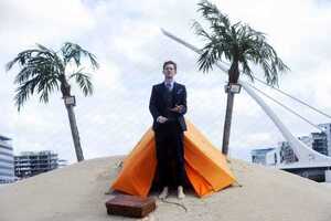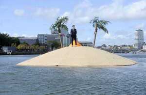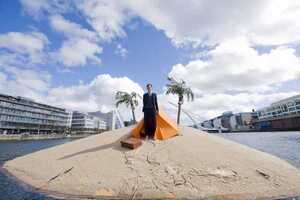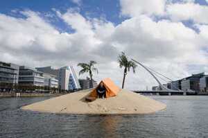 Artist Fergal McCarthy and his man-made tropical floating island on the River Liffey in Dublin where he will reside until next Saturday (September 18). The installation is part of ABSOLUT Fringe which opens this weekend and runs at various locations throughout Dublin until September 25.