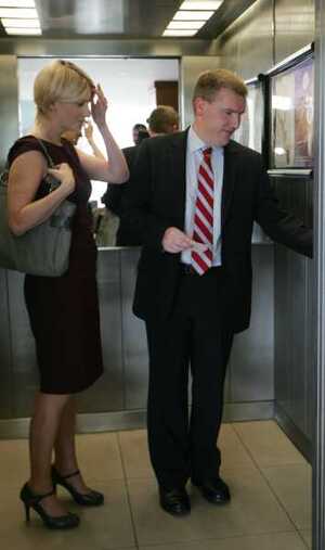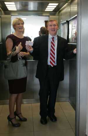 Fianna Fail’s Averil Power and Michael McGrath TD (with bust elevator) at the Fianna Fail think-in at the Maldron Hotel in Tallaght, West Dublin, literally within the last hour.