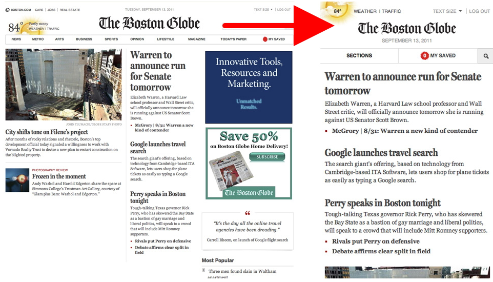 The Boston Globe rolled out a handsome new website, and it’s exemplary: No confusing mess of links, no upchuck of annoying ugly ads, and, best of all, no special crippled version for the iPhone or iPad.