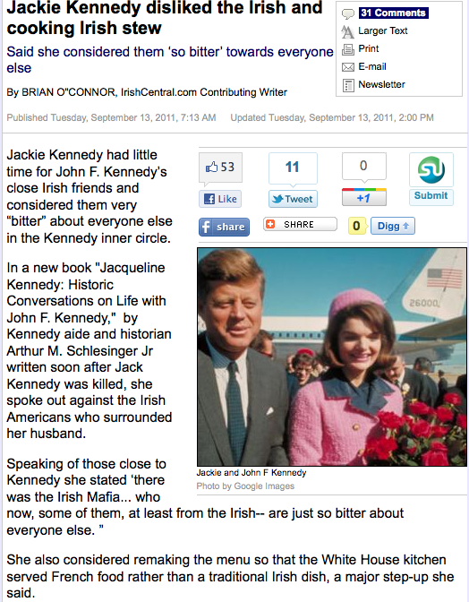 Jackie Kennedy Hated Us Admin at 4:54 pm September 14, 2011 Oh. Jackie Kennedy Disliked The Irish And Irish Stew (Brian O’Connor, Irish Central) FacebookTwitterPinterestSponsored Link