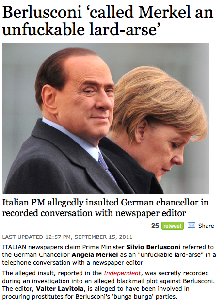 Photo Placement Win Admin at 5:20 pm September 15, 2011 Berlusconi ‘Called Merkel An Unfuckable Lard-Arse’ (First Post, The Week) Angela Merkel Undermined By Outspoken MPs (Tony Paterson, UK Independent) FacebookTwitterPinterestSponsored Link