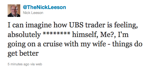 Sucks To be You Admin at 8:59 pm September 18, 2011 Nick Leeson On Twitter UBS Says Trading Losses Were Closer To $2.3 Billion (New York Times) FacebookTwitterPinterestSponsored Link