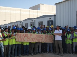 A Kerryman (right) arrives back on site in Saudi Arabia to a warm welcome from the overseas Dublin supporters club.
