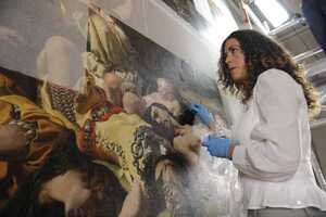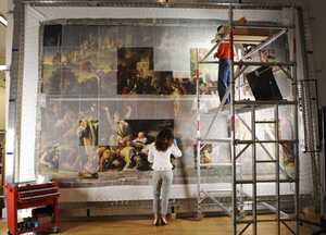 Muirne Lydon (on floor) and Peggy Reme (on scaffolding), both easel painting conservators, work on the Marriage of Strongbow And Aoife (1854) by Cork artist Daniel McLise at the National Gallery this morning. The ongoing work on the painting can now be followed online.