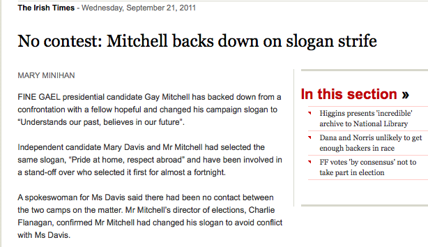 You Couldn’t Make It Up Admin at 1:59 am September 21, 2011 No Contest: Mitchell Backs Down On Slogan Strife (Mary Minihan, Irish Times) FacebookTwitterPinterestSponsored Link