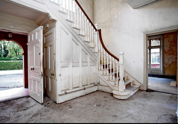 But the fireplaces were taken by thieves while Walford stood vacant for the past six years and there isn’t a stick of furniture in the house now. Black-and-white marble-effect linoleum in the entrance hall has gone too, leaving just the concrete floor, and all of the rooms have bare wooden floors and stripped walls; this is Bleak House.