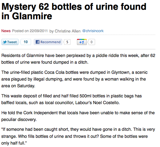 Mystery 62 Botles Of urine Found In Glanmire (Christine Allen, Cork Independent)
