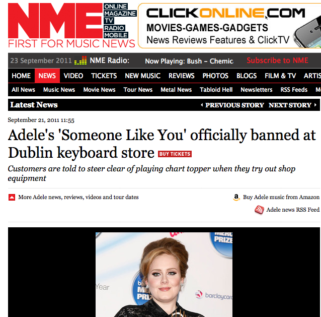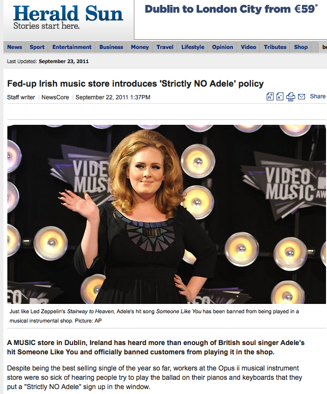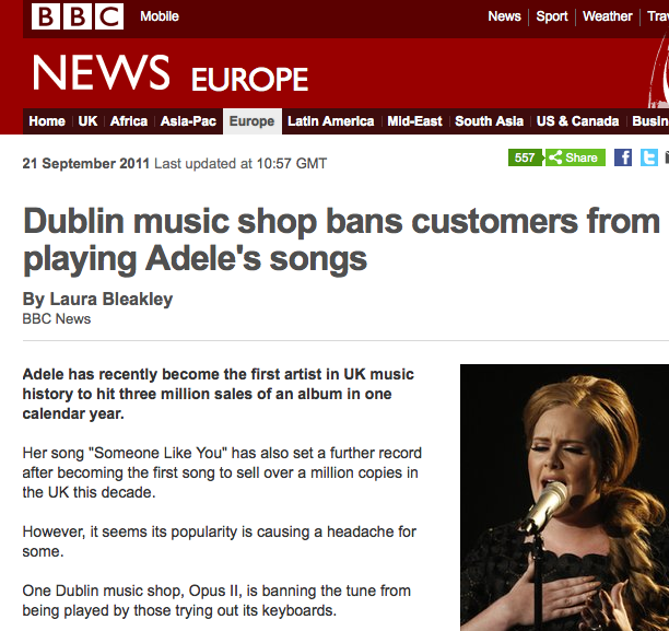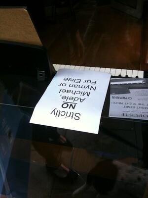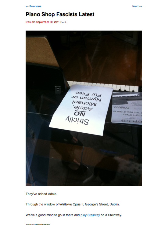 A shot taken through the window of Opus II piano shop on George’s Street, Dublin is sent in by regular contributor ‘onetwothreefour’ with the subject header: ‘Slightly Amusing Pic’.