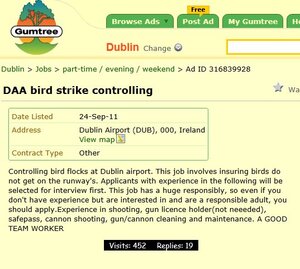 WANTED: Bird Strike Controller Admin at 9:53 am September 29, 2011 Bird Strike Controller (Gumtree) FacebookTwitterPinterestSponsored Link