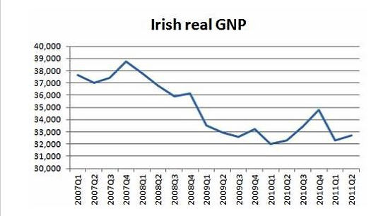 First of all, eventual recovery after years of Depression-level unemployment is a strange definition of success. But there’s also a specifically Irish twist. Pharma accounts for a large share of Irish exports — but it makes a much smaller contribution to the Irish economy. Partly that’s because pharma uses a lot of imported inputs, so that it has relatively low domestic content. Partly that’s because pharma is very capital-intensive, employing very few people — and the capital is foreign owned, so that the contribution to Gross National Product, which deducts income paid to foreigners, is smaller than the contribution to Gross Domestic Product, which doesn’t. Indeed, Ireland is one of those countries where you really want to track GNP rather than GDP to get a sense of how the country is doing.