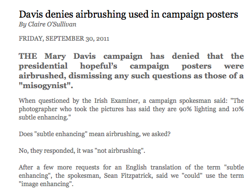 Davis Denies Airbrushing used In Campaign Posters (Claire O’Sullivan, Irish Examiner)
