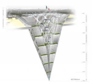 The design is an inverted pyramid with a central void to allow all habitable spaces to enjoy natural lighting and ventilation. To conserve the numerous activities that take place on the city square year round (concerts, political manifestations, open-air exhibitions, cultural gatherings, military parades.), the massive hole will be covered with a glass floor that allows the life of the Earthscraper to blend with everything happening on top.