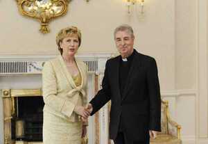 Former Papal Nuncio to Ireland Archbishop Giuseppe Leanza says goodbye to President McAleese this morning at the Aras.