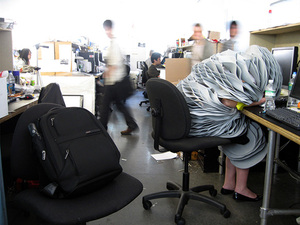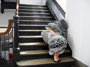 The Sleepsuit by Forrest Jessee is made of a structural pleat composed of EVA foam and based on US engineer Buckminster Fuller’s notion of Dymaxion or Polyphasic Sleeping (a regime of 30 minute naps every six hours to achieve more time awake during the day.)
