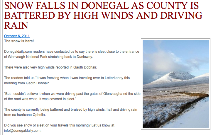 Snow In Donegal Admin at 2:19 pm October 6, 2011 Snow Falls In Donegal (DonegalDaily) Thanks Molly Fulton FacebookTwitterPinterestSponsored Link