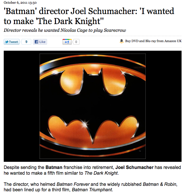Things Can ALWAYS Be Worse Admin at 3:00 pm October 6, 2011 ‘Batman’ Director Joel Schumacher: ‘I Wanted To Make ‘The Dark Knight” (NME) FacebookTwitterPinterestSponsored Link