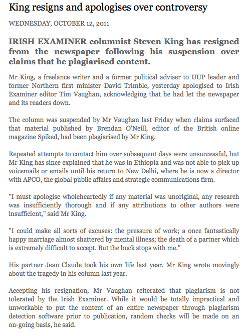 King Resigns And Apologises Over Controversy (Irish Examiner)
