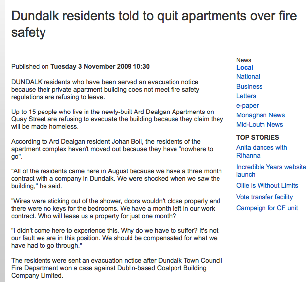 Dundalk Residents Told To Quit Apartments Over Fire Safety (Dundalk Democrat, November 3, 2009)