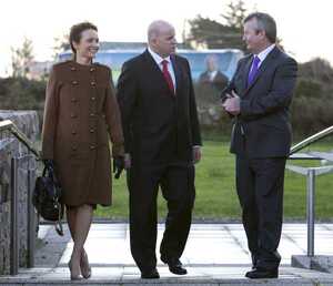 Sean Gallagher and his wife Trish arriving at TG4 HQ in Galway (with the station’s chief executive Pol O Gallchoir) literally within the last 30 minutes.