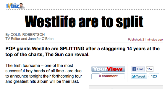 A Nation Mourns Admin at 6:18 pm October 19, 2011 Westlife Are To Split (The Sun) FacebookTwitterPinterestSponsored Link
