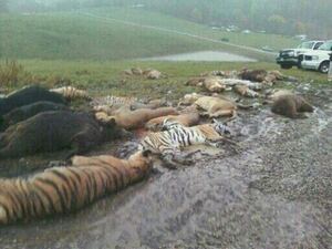 When initial attempts to sedate them were deemed too risky, 48 were shot and buried by police including 18 Bengal tigers (fewer than 2500 remain in the wild), nine lions, eight lionesses, three mountain lions, six black bears, two grizzly bears and a baboon.