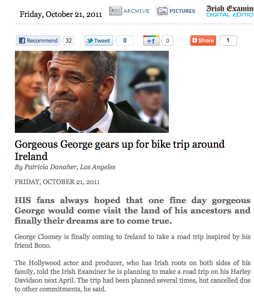 Contain Yourselves, Ladies. Admin at 3:51 pm October 21, 2011 A bike ride. Oh, never mind. Gorgeous George Gears Up For Bike Ride Around Ireland (Patricia Danaher, Irish Examiner) FacebookTwitterPinterestSponsored Link