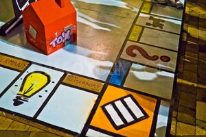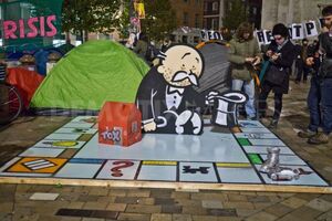 A version of the Monopoly board complete with accessories, a penniless Frank Moneybags, a series of transnational corporations in place of utilities and a shoutout to fellow tagger Tox – Banksy’s show of support for the OccupyLondon movement at St Paul’s Cathedral last night.