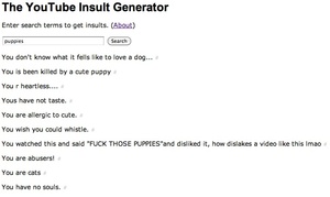 Enter a keyword and Adam Hovalty’s YouTube Insult Generator will trawl through YouTube comments for vaguely related put-downs from the internet’s wellspring of Google Translate randomness and unfocused teen bile.