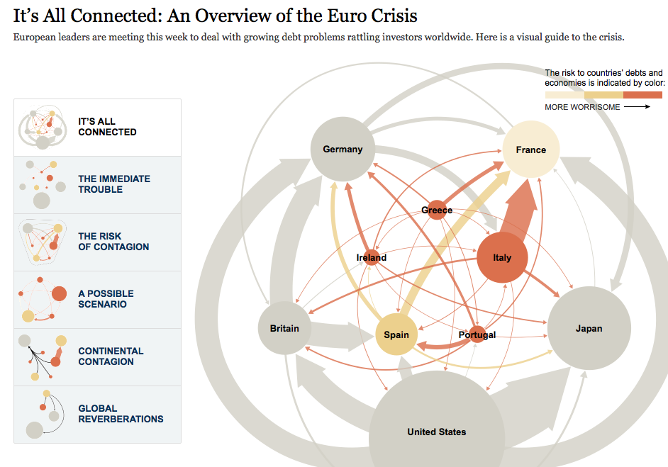 Click here for a depressing but beautiful and fascinating interactive Euro crisis connection infographic. from The New York Times. Soon all online newspapers will be doing this.