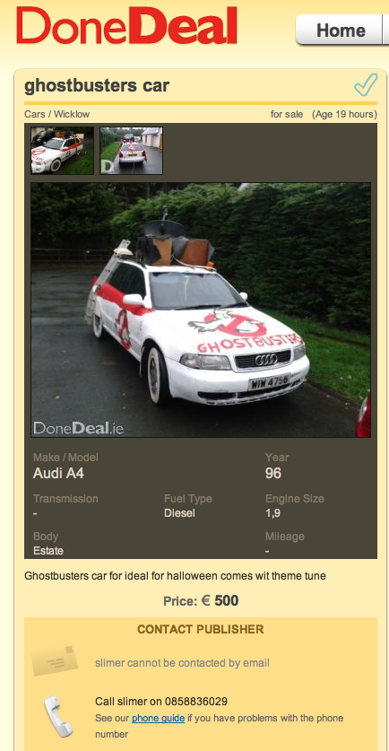 If There’s Something Strange In Your Neighbourhood, Etc. Admin at 11:39 am November 1, 2011 Ghostbusters Car For Sale (Done Deal) Thanks Aidan Molloy FacebookTwitterPinterestSponsored Link