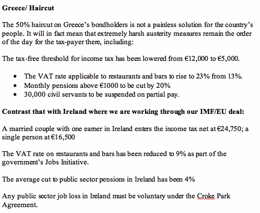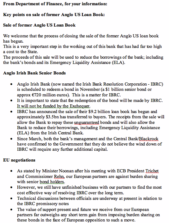 Here’s the bull***t that passes for ‘advisory analysis’ for politicians – the copy of the note sent out to Government TDs from a specific party based on the Department of Finance information. I am publishing it here without any specific comments – judge for yourselves reading it – my only general comment is that it uses a number of deceitful tricks, false juxtapositions and selective omissions to present the case for repaying unsecured unguaranteed bondholders in Anglo Irish Bank / IBRC.