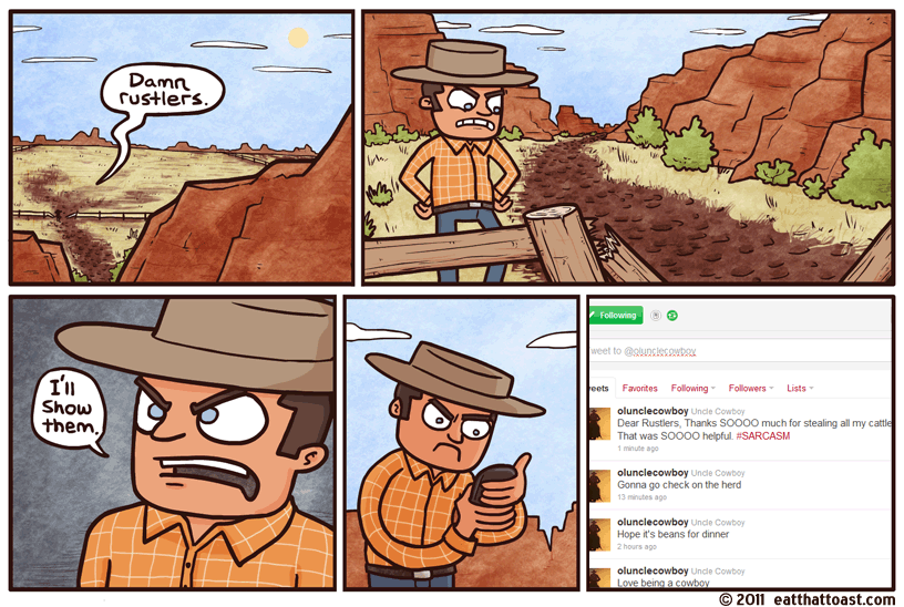 #SARCASM Niall Murphy at 3:46 pm November 15, 2011 Eat That Toast FacebookTwitterPinterestSponsored Link Related posts: Twitter Comix: They’re Calling Them ‘Twags’ Someone’s Trying To Kill TWITTER Paul Zachary Myers Versus David Quinn: It’s A Tweet-Off This Should End Well