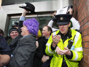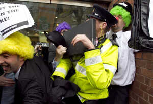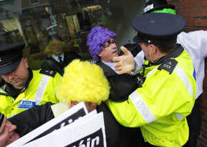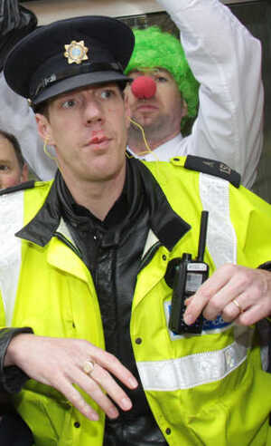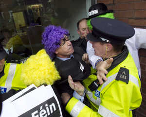 PICTURES: Garda Walloped By Clown’s Briefcase Admin at 3:00 pm November 21, 2011 Ouch. No, seriously. The Sinn Fein protest outside EU House in Dawson Street, Dublin within the last hour. (Leon Farrell/Photocall Ireland) FacebookTwitterPinterestSponsored Link