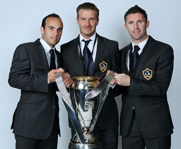 Robbie Keane, David Beckham (centre) and Landon Donovan (left), who were all involved in the touchdown goal that secured LA Galaxy the ASL Soccer World Series Superbowl Pennant championship last night in California.