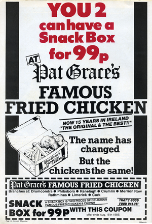Advertising From The Last Recession Admin at 3:04 pm November 23, 2011 “Found this gem from a U2 souvenir concert mag, 1985. Bet you forgot about Pat Grace’s ‘famous’ fried chicken.” (ineverthoughidenduphere) FacebookTwitterPinterestSponsored Link