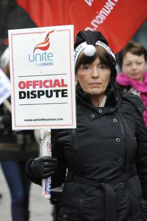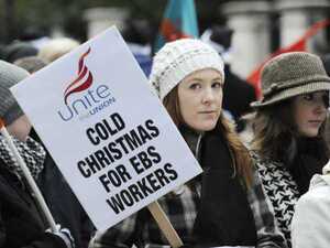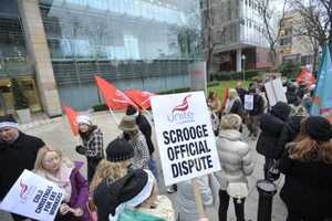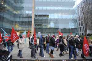 EBS building society workers (who are also members of the UNITE trade union) picket outside the company’s HQ on Burlington Road, Dublin literally earlier. They are protesting against the loss of a ’13th month’ payment, which they claim is due to them from the company.