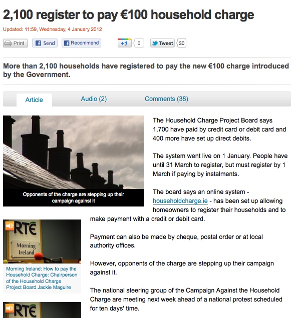 “So these [1200], are they Judas goats – a term borrowed from the livestock industry for an animal which leads others to the slaughterhouse, also known as a “Judas cow”, the Judas goat is trained to lead others to the slaughterhouse, walks out the other side and is rewarded for its repeat efforts. Or do people recognise the €18bn annual deficit this country is running, and they see the €100 charge as a necessary contribution to plug the deficit. Difficult to know, but the unfairness of the charge – which is €100 regardless of whether you live in a mansion or a studio flat, earn €1m or the minimum wage, own your house outright or are shouldered with negative equity – really does stand out.”