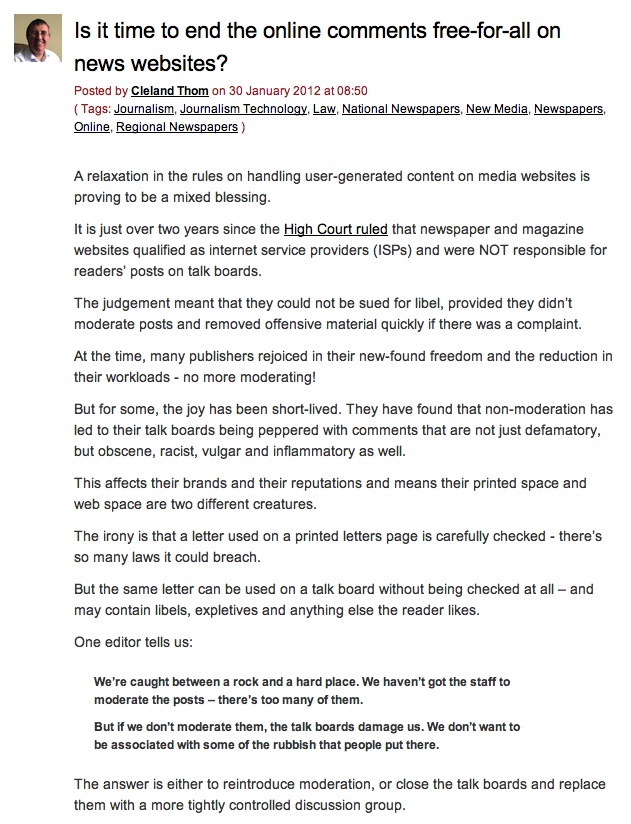 Navel Gazing Admin at 12:24 pm January 30, 2012 Is It Time To End The Online Comments Free-For-All On News Websites? (UK Press Gazette) FacebookTwitterPinterestSponsored Link Related posts: So You Found Something Cool On The Internet. What Now? 11:11am, November 11th, 2011 Kill It With Ire Your New Internet Music Station Has Arrived