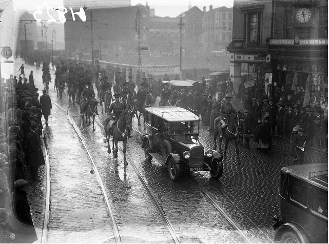 This is the procession for James MacNeill, newly sworn in Governor General of the Irish Free State. Our catalogue had this as Westmoreland Street, Dublin. I’d be happier that this is actually the head of the procession on O’Connell Street, having just passed over O’Connell Bridge. Would you agree?