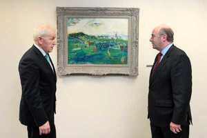 Arts minister Jimmy Deenihan and AIB chairman David Hodgkinson within the last hour. AIB are handing over (ha!) 39 “major artworks’ to the state including the painting above.