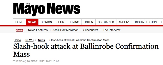 Who Brings A Slash Hook To A Confirmation? Admin at 4:07 pm February 28, 2012 Slash-hook Attack At Ballinrobe Confirmation Mass (Mayo News) FacebookTwitterPinterestSponsored Link Related posts: Meanwhile, In Turlough, Castlebar, Mayo Meanwhile, In Mayo Well Fancy That A Word In Your Shell-Like