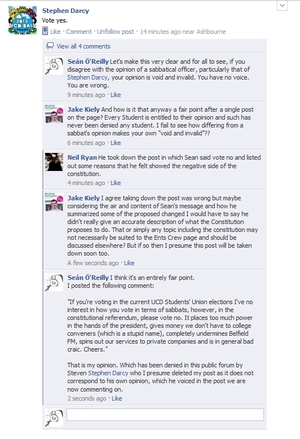 The exchange (above) took place on the UCD Ents (events) Crew page on Facebook. A student posted an opinion on the new constitution for the UCD Students Union which was then deleted as is was not in agreement with the Events officer’s own. Needless to say, the conversation