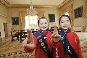 President Higgins meeting members of the Irish Girl Guides earlier at Áras an Uachtaráin. Top from left: Ciara Carroll, Aoife Whelan, Squee, Aisling O’Reilly and Aoibhinn McDonald. And, bottom pic, Ciara and Aoife making the ‘Ladybird salute’.