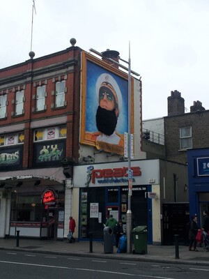 Hand-painted billboard and actual hairy beard promoting Sacha Baron Cohen’s new film The Dictator.