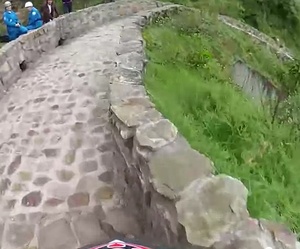 Mountain biker Marcelo Gutierrez hurtles down the stairs and cobblestones of a ridiculously bumpy Red Bull Devotos de Monserrate 2012 downhill course in Bogotá.